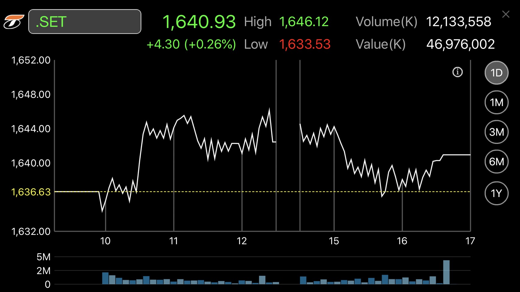 ผู้สื่อข่าวรายงานว่า ตลาดหลักทรัพย์ปิดวันนี้ที่ระดับ 1,640.93 จุด เพิ่มขึ้น 4.30 จุด หรือร้อยละ 0.26 มูลค่าการซื้อขาย 46,976.00 ล้านบาท การซื้อขายหุ้นวันนี้ ดัชนีหุ้นไทยเคลื่อนไหวในแดนบวกเป็นส่วนใหญ่ โดยดัชนีฯแตะจุดสูงสุดที่ 1,646.12 จุด และแตะจุดต่ำสุดที่ระดับ 1,633.53 จุด