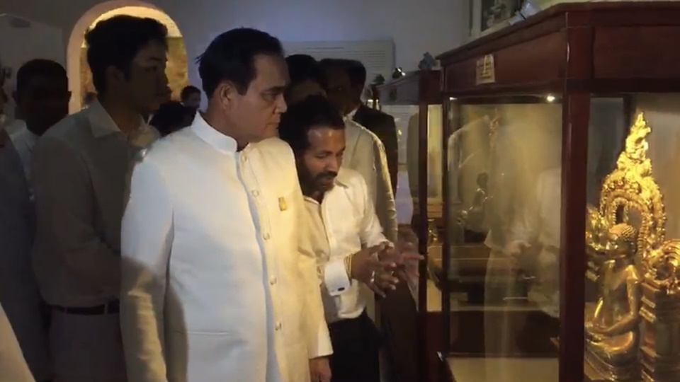 จากนั้น นายกรัฐมนตรีและภริยา เดินทางมายังพิพิธภัณฑ์พุทธศาสนาโลก ซึ่งตั้งอยู่ภายในวัดพระธาตุเขี้ยวแก้ว ก่อนจะนมัสการและถวายอัฐบริขารแด่มหานายกะฝ่ายมัลวัตตะ และมหานายกะฝ่ายอัสกิริยา จากนั้น นายกรัฐมนตรีมอบของที่ระลึกแก่นีลาเม วัดพระธาตุเขี้ยวแก้ว และนีราเม วัดพระธาตุเขี้ยวแก้วมอบของที่ระลึกแด่นายกรัฐมนตรี