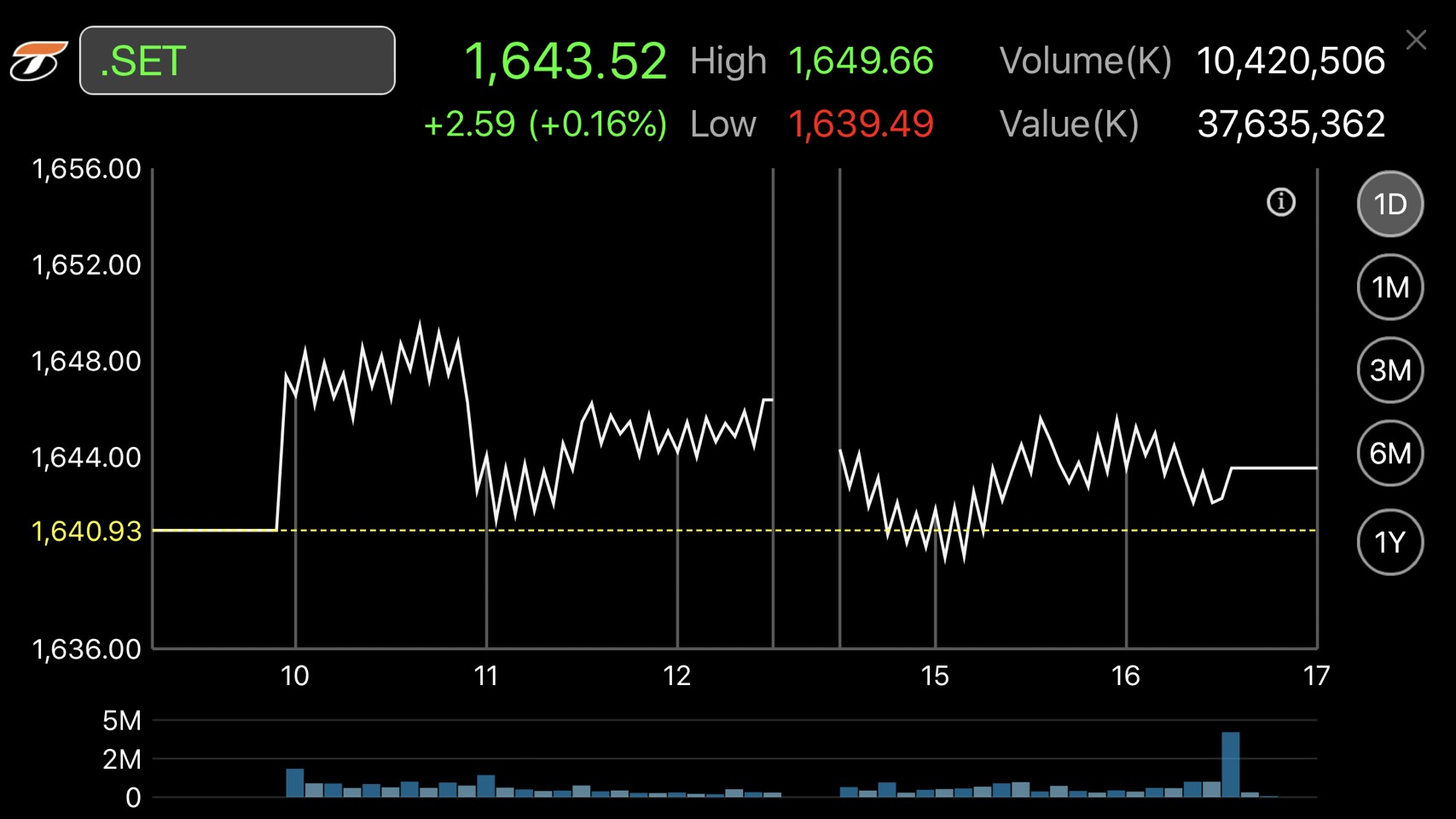ตลาดหลักทรัพย์แห่งประเทศไทย 13 ก.ค. – ดัชนีตลาดหุ้นไทยปิดที่ 1,643.52 จุด เพิ่มขึ้น 2.59 จุด หรือ ร้อยละ 0.16 มูลค่าการซื้อขาย 37,635.36 ล้านบาท