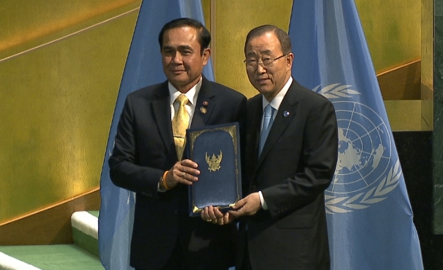 นายกรัฐมนตรีประกาศการเข้าเป็นภาคีความตกลงปารีสของประเทศไทย ว่า ประเทศไทยมีความยินดีที่ได้เข้าร่วมเป็นภาคีความตกลงปารีสในวันนี้ การเปลี่ยนแปลงสภาพภูมิอากาศเป็นปัญหาระดับโลกที่ส่งผลกระทบต่อทุกประเทศ สำหรับประเทศไทยซึ่งเป็นประเทศกำลังพัฒนา ผลกระทบที่เกิดขึ้นยิ่งมีนัยสำคัญและเป็นผลกระทบกว้างขวาง ไม่ว่าจะเป็นภาวะโลกร้อน ภัยพิบัติ กระทบต่อการทำกินและรายได้ของเกษตรกร ก่อให้เกิดความยากจน เป็นภัยต่อความมั่นคงทางอาหาร และท้ายที่สุด เป็นอุปสรรคต่อการพัฒนาที่ยั่งยืน ผลกระทบเหล่านี้ไม่เพียงเป็นภัยต่อโลกปัจจุบัน แต่มีผลถึงลูกหลานของพวกเราในอนาคต