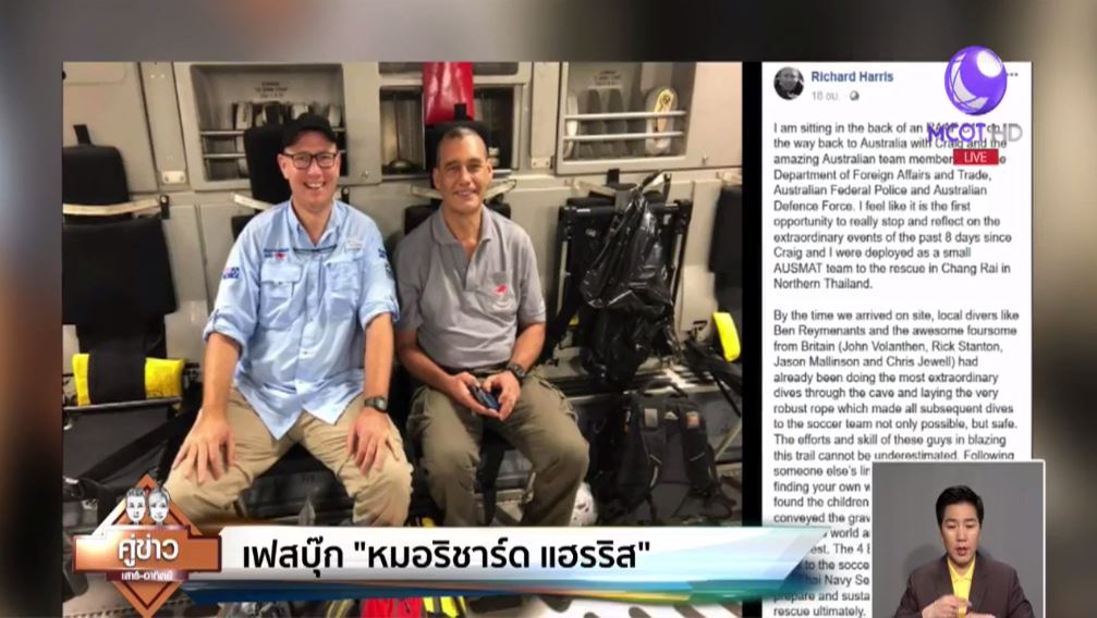 ออสเตรเลีย 14 ก.ค.61- หมอริชาร์ด แฮร์ริส ที่ร่วมปฏิบัติการกู้ชีวิตทีมหมูป่า ผู้สูญเสียบิดาในช่วงที่หมอกำลังช่วยทีมหมูป่าอยู่ในถ้ำ ได้โพสต์ข้อความทางเฟซบุ๊ก Richard Harris ไว้ค่อนข้างยาว เล่ารายละเอียดบางอย่างระหว่างปฏิบัติการไว้อย่างน่าสนใจ พยายามจะให้เครดิตแก่ทุกฝ่ายที่ต่างมีส่วนทำให้ปฏิบัติการช่วยเหลือประสบความสำเร็จ