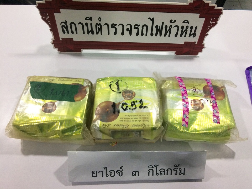 พ.ต.ท.มงคล พรหมเมศร์ สว.ส.รฟ.หัวหิน จ.ประจวบคีรีขันธ์ นำชุดเจ้าหน้าที่ตรวจตราความเรียบร้อยบนขบวนรถเร็วที่ 171 กรุงเทพ-สุไหงโก-ลก แล่นเข้าชานชลาสถานีรถไฟหัวหิน และพบกระเป๋าพลาสติกวางอยู่ชั้นสัมภาระโบกี้ที่ 11 แต่ไม่มีใครแสดงตัวเป็นเจ้าของ เมื่อเปิดดูพบว่าเป็นยาเสพติดประเภทไอซ์จำนวน 3 ถุง ถุงละ 1 กิโลกรัม รวม 3 กิโลกรัม และพบกระเป๋าเป้อีกใบในโบกี้ที่ 2 ไม่มีใครเป็นเจ้าของ ภายในกระเป๋ามีห่อยาบ้าจำนวน 3,000 เม็ดจึงยึดไว้เป็นหลักฐาน ส่วนยาเสพติดทั้งหมดคาดว่ามูลค่าเกือบ 10 ล้านบาท.-สำนักข่าวไทย