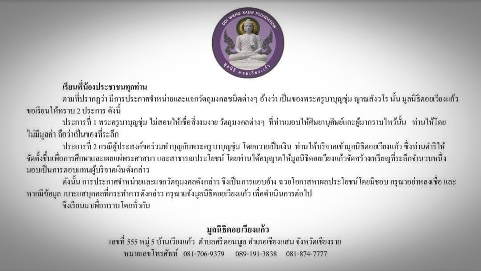 สำนักข่าวไทย 15 ก.ค.-แถลงการณ์ชี้แจง‘พระครูบาบุญชุ่ม’ ไม่สอนให้เชื่อสิ่งงมงาย วัตถุมงคลต่างๆ ที่มอบให้ศิษย์ ผู้มากราบไหว้ ให้โดยไม่มีมูลค่า ถือเป็นของที่ระลึก หลังมีการประกาศจำหน่ายและแจกวัตถุมงคล อ้างเป็นของพระครูบุญชุ่ม