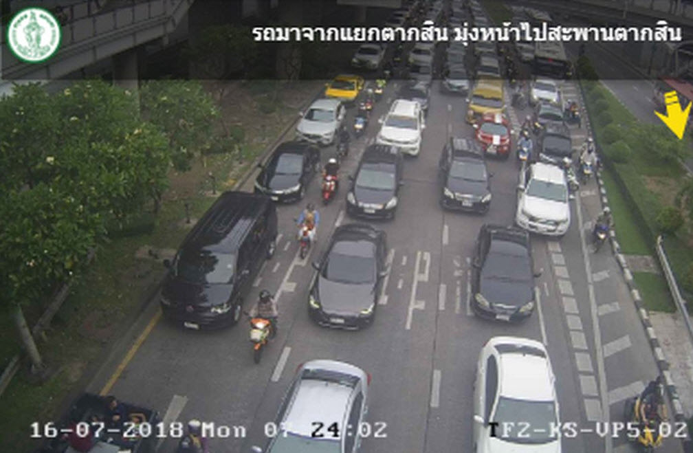 กทม. 16 ก.ค.-สวพ.FM91 รายงานจราจร ถนนกรุงธนบุรี ขาเข้า มุ่งหน้าขึ้นสะพานตากสิน รถติดขัดมาก ท้ายสะสมใต้บีทีเอสวงเวียนใหญ่