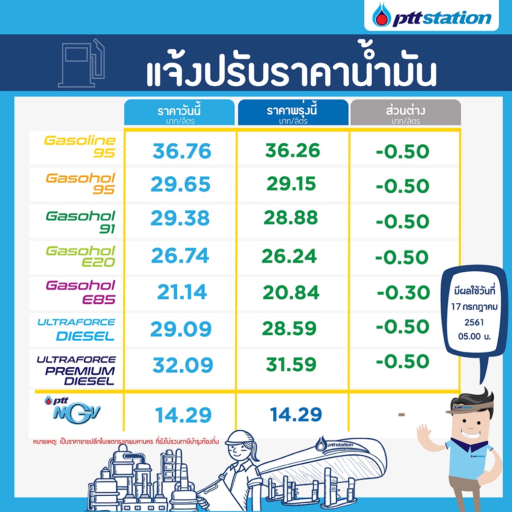 PTTOR แจ้งปรับลดราคาขายปลีกน้ำมันกลุ่มเบนซินและดีเซล 50 สตางค์ต่อลิตร ยกเว้น E85 ลดลง 30 สตางค์ต่อลิตร มีผลวันที่ 17 กรกฎาคม เวลา 05.00 น. เป็นต้นไป โดยราคาขายปลีกเป็นดังนี้ เบนซิน 95 ลิตรละ 36.26 บาท แก๊สโซฮอล์ 95 ลิตรละ 29.15 บาท E20 ลิตรละ 26.24 บาท แก๊สโซฮอล์ 91 ลิตรละ 28.88 บาท E85 ลิตรละ 20.84 บาท ดีเซล ลิตรละ 28.59 และดีเซลพรีเมี่ยม 31.59 บาทต่อลิตร โดยราคาขายปลีกข้างต้นยังไม่รวมภาษีบำรุงกรุงเทพมหานคร.-สำนักข่าวไทย