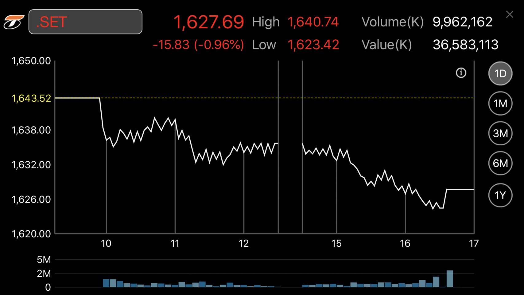 ตลาดหลักทรัพย์ปิดวันนี้ที่ระดับ 1,627.69 จุด ลดลง 15.83 จุด หรือร้อยละ 0.96 มูลค่าการซื้อขาย 36,583.11 ล้านบาท