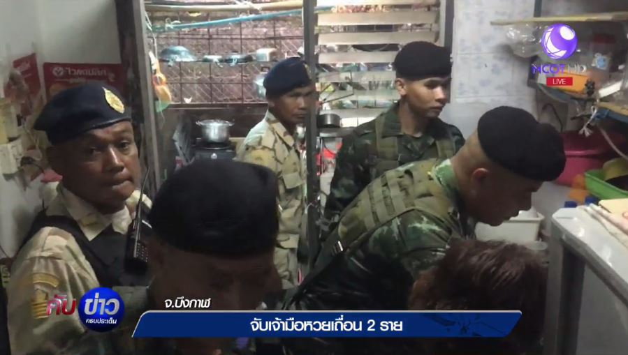 บึงกาฬ 16 ก.ค.-ฝ่ายปกครองสนธิกำลังร่วมกับทหารและตำรวจจับเจ้ามือหวยเถื่อนในเมืองบึงกาฬ 2 ราย พร้อมโพยหวยเพียบ