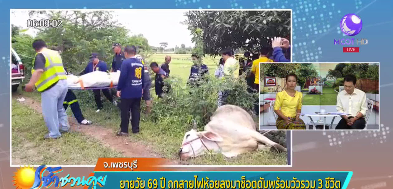 เพชรบุรี 17 ก.ค.-ยายวัย 69 ปี เลี้ยงวัวกลางทุ่งนา ถูกสายไฟฟ้าที่ห้อยลงมาจากเสาช็อตเสียชีวิต พร้อมแม่วัวท้องแก่อีก 2 ตัว
