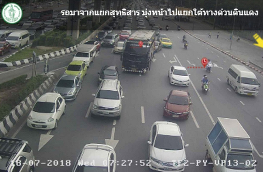 ถนนวิภาวดี-รังสิต ขาเข้า มุ่งหน้าใต้ด่วนดินแดง รถเคลื่อนตัวได้ช้าท้ายสะสมบนสะพานข้ามแยกสุทธิสาร