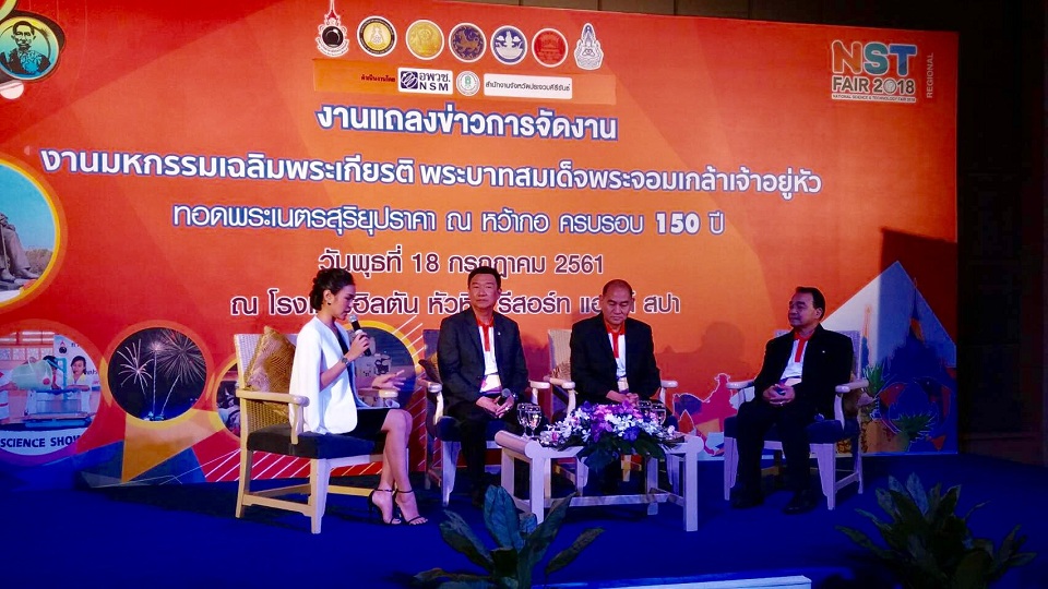 นายพัลลภ สิงหเสนี ผู้ว่าราชการจังหวัดประจวบคีรีขันธ์ นายสุวรงค์ วงษ์ศิริ รองผู้อำนวยการองค์การพิพิธภัณฑ์วิทยาศาสตร์แห่งชาติ หรือ อพวช. และนายเบญจพล พาลี ผู้อำนวยการอุทยานวิทยาศาสตร์พระจอมเกล้า ณ หว้ากอ จ.ประจวบคีรีขันธ์ แถลงที่โรงแรมฮิลตัน อ.หัวหิน วันนี้ (18 ก.ค.) เตรียมเปิดงานมหกรรมเฉลิมพระเกียรติพระบาทสมเด็จพระจอมเกล้าเจ้าอยู่หัว (รัชกาลที่ 4) ทอดพระเนตรสุริยุปราคา ณ หว้ากอ ครบรอบ 150 ปี วันที่ 18-24 ส.ค.นี้ ที่อุทยานวิทยาศาสตร์พระจอมเกล้า ณ หว้ากอ อ.เมืองประจวบคีรีขันธ์ โดยจังหวัดได้บูรณาการร่วมกับกระทรวงศึกษาธิการ กระทรวงวิทยาศาสตร์และเทคโนโลยี และกระทรวงการท่องเที่ยวและกีฬา เพื่อเฉลิมพระเกียรติ และขยายโอกาสการเรียนรู้ด้านวิทยาศาสตร์สู่ภูมิภาค สร้างแรงบันดาลใจให้เยาวชนประดิษฐ์คิดค้นนวัตกรรมใหม่เพื่อพัฒนาประเทศ ภายใต้แนวคิด “จุดประกายความคิด พัฒนาชีวิตด้วยวิทยาศาสตร์ พัฒนาชาติด้วยเทคโนโลยี สู่วิถีนวัตกรรม”