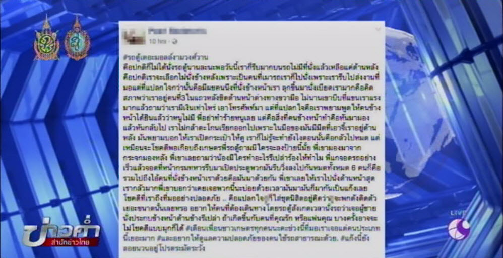 ความคืบหน้ากรณีนักศึกษาสาวมหาวิทยาลัยแห่งหนึ่งย่านบางเขน โพสต์ข้อความใน Facebook เมื่อวานนี้ โดยระบุว่าถูกกลุ่มคนร้าย 6-7 คน รุมปล้นทรัพย์บนรถตู้ แต่คนขับสังเกตเห็นและคนร้ายทั้งหมดหลบหนีไปได้ เหตุเกิดบริเวณถนนรามอินทรา กม. 8 ถึงหน้าค่ายทหารย่านบางเขน