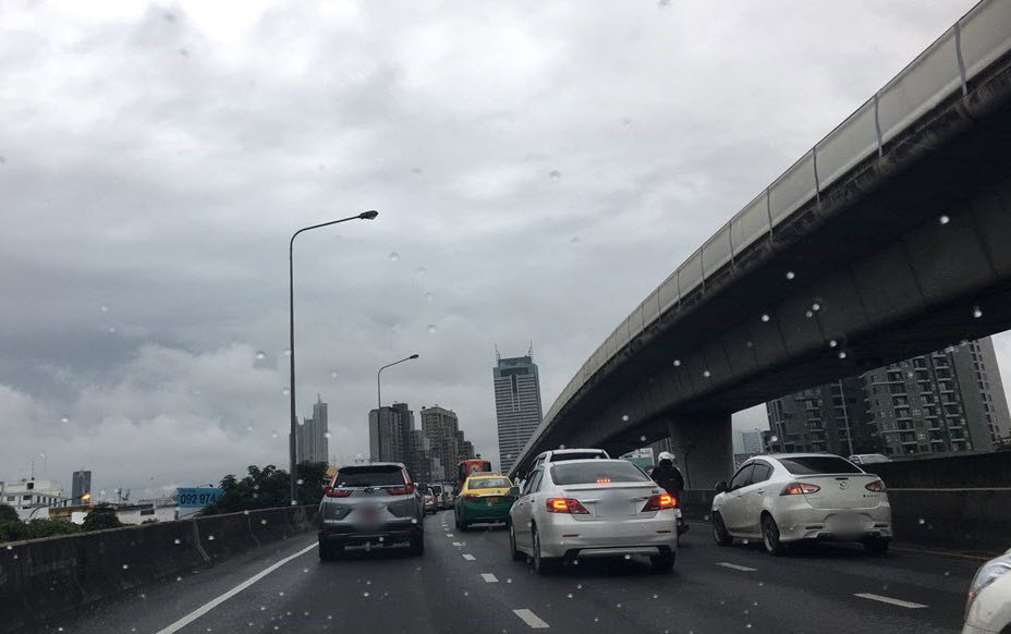 ถนนกรุงธนบุรี ขาเข้า ขึ้นสะพานสมเด็จพระเจ้าตากสิน รถเริ่มมาก ท้ายสะสมกลางสะพานข้ามแยกตากสินไปแล้ว.-สำนักข่าวไทย