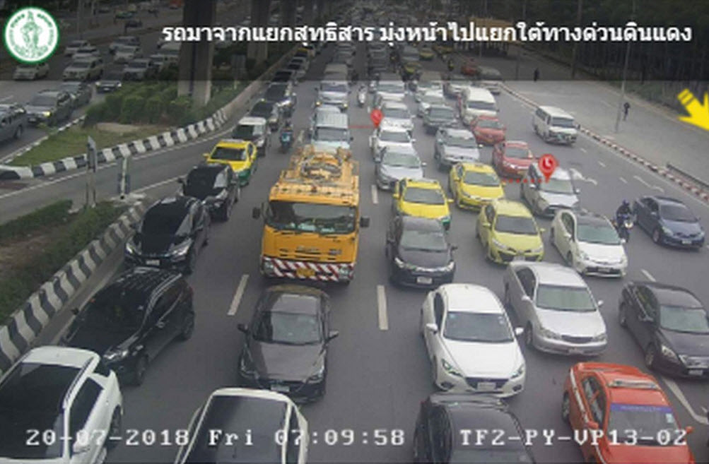 ถนนวิภาวดี-รังสิต ขาเข้า มุ่งหน้าใต้ด่วนดินแดง รถติดขัดมาก ท้ายสะสมอยู่ที่หน้าโรงเรียนสุรศักดิ์มนตรี