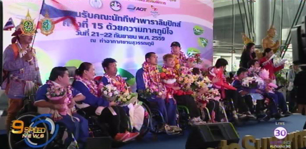พันโทรุจ แสงอุดม รองผู้ว่าการ การกีฬาแห่งประเทศไทย และจุตินันท์ ภิรมย์ภักดี ประธานคณะกรรมการพาราลิมปิกแห่งประเทศไทย ให้การต้อนรับและมอบดอกไม้ให้กำลังใจนักกีฬาพาราลิมปิกชุดแรกที่เดินทางมาถึงสนามบินสุวรรณภูมิ ประกอบด้วย นักกีฬาว่ายน้ำ ยิงปืน เทเบิลเทนนิส และบ็อกเซีย รวม 24 คน หลังจากสร้างผลงานได้อย่างยอดเยี่ยมในการแข่งขันพาราลิมปิกที่นครรีโอเดจาเนโร ของบราซิล คว้ามาได้ 6 เหรียญทอง 6 เหรียญเงิน และ 6 เหรียญทองแดง บรรยากาศการต้อนรับเป็นไปด้วยความอบอุ่น โดยมีบรรดาพ่อแม่ญาติพี่น้องและแฟนกีฬา รวมทั้งสื่อมวลชนจำนวนมากมารอทำข่าว