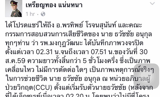 พล.ต.นพ.เหรียญทอง แน่นหนา ผู้อำนวยการโรงพยาบาลมงกุฏวัฒนะ โพสต์เฟสบุคถึง พญ.คุณหญิงพรทิพย์ โรจนสุนันท์ และคณะกรรมการสอบสวนการเสียชีวิตของนายธวัชชัย อนุกุล โดยระบุว่า รพ.มงกุฎวัฒนะ ได้บันทึกภาพวงจรปิดตั้งแต่เวลา 02.31-07.51 น.ของวันที่ 30 ส.ค.2559 ความยาวกว่า 5 ชั่วโมงครึ่ง ซึ่งเป็นภาพเคลื่อนไหว ไม่มีการตัดต่อ เป็นภาพเหตุการณ์จริง ในการช่วยชีวิตนายธวัชชัย ณ หน่วยอภิบาลผู้ป่วยวิกฤต(CCU) ตั้งแต่เริ่มรับตัวนายธวัชชัย (หลังจากที่ได้เอ็กซเรย์เมื่อเวลา 02.20 น.โดยพบว่าไม่มีซี่โครงหัก) จนถึงเวลา 07.51 ที่ได้เคลื่อนย้ายศพออกจากเตียง ลำดับเหตุการณ์ดังนี้