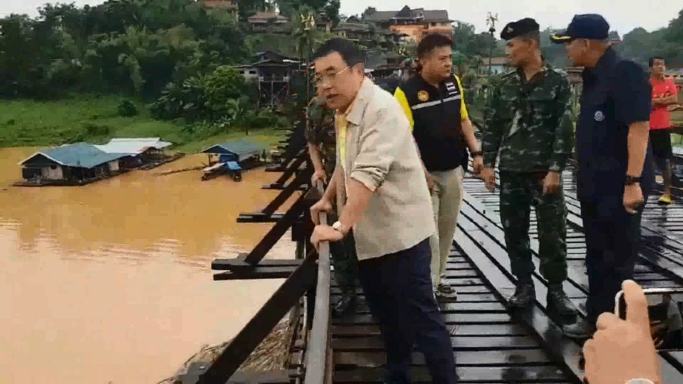 เมื่อเวลา 08.00 น. (21 ก.ค.) นายจีระเกียรติ ภูมิสวัสดิ์ ผู้ว่าราชการจังหวัดกาญจนบุรี พร้อมนายอำเภอสังขละบุรี ทหารหน่วยเฉพาะกิจลาดหญ้า กำนันผู้ใหญ่บ้าน ร่วมตรวจสภาพแม่น้ำซองกาเรียบริเวณสะพานไม้อุตตมานุสรณ์ หรือสะพานมอญ โดยพบว่าแม้ระดับน้ำยังทรงตัวจากฝนตกต่อเนื่อง แต่ต้องติดตามอย่างใกล้ชิด แม้วันนี้การไหลของน้ำไม่รุนแรงเหมือนวานนี้ แต่มีเศษซากไม้และวัชพืชลอยมาอัดแน่นอยู่บริเวณตอม่อ จึงกำชับให้เจ้าหน้าที่เร่งจัดเก็บ เพื่อให้น้ำไหลผ่านได้สะดวก และป้องกันผลกระทบกับสะพาน
