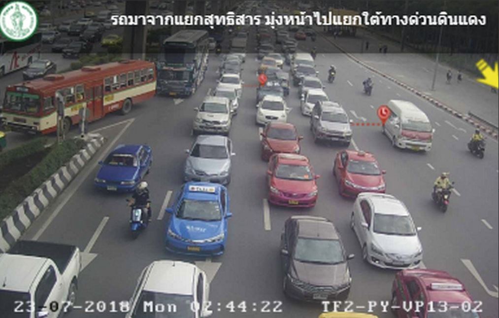 ถนนวิภาวดี-รังสิต ขาเข้า จากแยกสุทธิสาร มุ่งหน้าใต้ด่วนดินแดง รถมาก เคลื่อนตัวช้า ติดขัดเข้าอนุสาวรีย์ชัยฯ ท้ายสะสมแยกสุทธิสาร