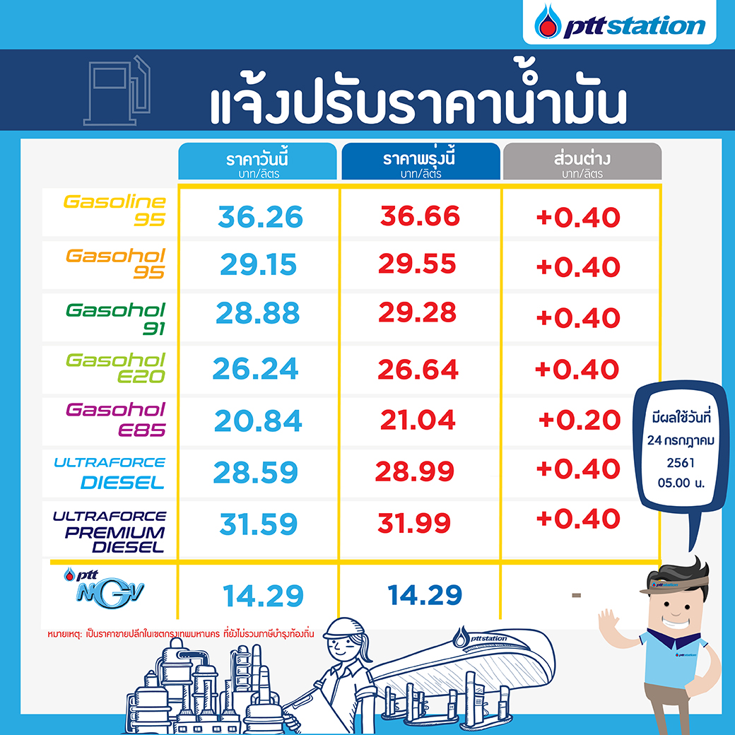 กรุงเทพฯฯ 23 ก.ค. – PTTOR – บางจากฯ ปรับขึ้นราคาขายปลีกน้ำมันทุกชนิด 40 สต. ส่วน E85 ขึ้น 20 สต. มีผล 24 ก.ค. เวลาตี 5
