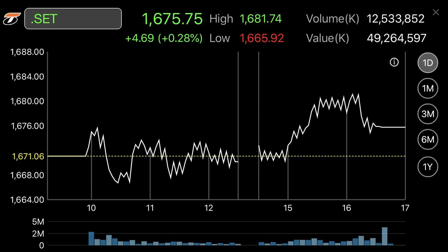 ผู้สื่อข่าวรายงานว่าดัชนีตลาดหุ้นไทยปิดการซื้อขายวันนี้ (23 ก.ค.) ที่ระดับ 1,675.75 จุด เพิ่มขึ้น 4.69 จุด หรือร้อยละ 0.28 มูลค่าการซื้อขาย 49,264.60 ล้านบาท การซื้อขายหุ้นไทยแกว่งตัว โดยดัชนีสูงสุดของวันที่ระดับ 1,681.74 จุด และต่ำสุดที่ 1,665.92 จุด โดยมีแรงซื้อหุ้นกลุ่มแบงก์ หลังประกาศผลประกอบการไตรมาส 2/61 ออกมาอยู่ในเกณฑ์ดี