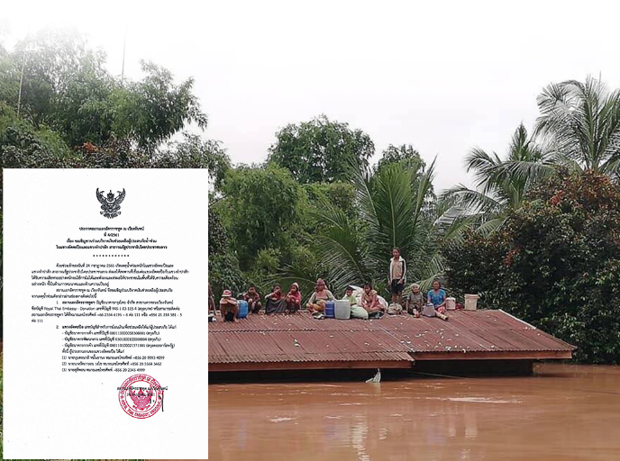 น.ส.บุษฎี สันติพิทักษ์ อธิบดีกรมสารนิเทศ และโฆษกกระทรวงการต่างประเทศ กล่าวว่าจากเหตุการณ์เขื่อนเซเปี่ยน – เซน้ำน้อย ที่ตั้งอยู่บนที่ราบสูงบอละเวน แขวงอัตตะปือ ห่างจากเมืองปากเซ ประมาณ 80 กิโลเมตร ได้เกิดรอยแตกบริเวณสันเขื่อน ส่งผลให้มวลน้ำกว่า 5 พันล้านลูกบาศก์เมตรไหลท่วมทะลักพื้นที่ใกล้เคียงนั้น ล่าสุดนายเกียรติคุณ ชาติประเสริฐ เอกอัครราชทูต ณ เวียงจันทน์ สาธารณรัฐประชาธิปไตยประชาชนลาว มีกำหนดมอบเงินช่วยเหลือของ สอท.ในเบื้องต้น จำนวน 1 แสนบาทจำนวนเบื้องต้น ให้แก่นางคำเพา เอินทะวัน รองรัฐมนตรีว่าการกระทรวงการต่างประเทศ สปป. ลาว ในวันพรุ่งนี้ (25ก.ค.) และเตรียมขอรับนโยบายจากรัฐบาลไทยว่าจะให้การช่วยเหลืออย่างไรต่อไป