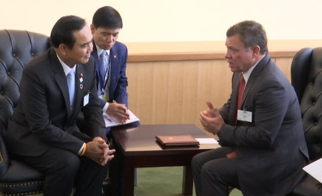 นิวยอร์ค 20 ก.ย.- นายกฯ เช้าร่วมพิธีเปิดการประชุมสมัชชาสหประชาชาติ สมัยสามัญ ครั้งที่ 71 พร้อมใช้โอกาสนี้ หารือทวิภาคีกับสมเด็จพระราชาธิบดีแห่งจอร์แดน โดย 2 ฝ่ายพร้อมสานความร่วมมือที่มีต่อกันอย่างต่อเนื่อง และขอบคุณจอร์แดนที่สนับสนุนไทยกรอบ OIC