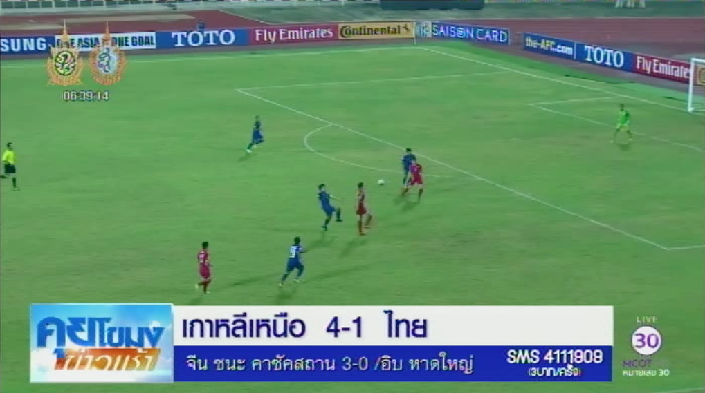 การแข่งขันฟุตบอลชิงแชมป์เอเชีย รุ่นอายุไม่เกิน 16 ปี รอบแบ่งกลุ่ม กลุ่มดี นัดที่สอง ที่ประเทศอินเดีย เมื่อวาน นาทีที่ 40 ไทยเสียจุดโทษจากจังหวะที่ ทรงวุฒิ ใคร่ครวญ ไปสกัดใส่ คิม ฮวี ฮวาง และเป็น คเย ทัมที่สังหารเข้าไปให้ เกาหลีเหนือ ขึ้นนำก่อน 1-0 และจบครึ่งแรกด้วยสกอร์นี้ ครึ่งหลังนาทีที่ 63 เกาหลีเหนือมาได้ประตูหนีห่างและเป็น คเย ทัม วอลเลย์เข้าไปให้แชมป์เก่าหนีไทยไปเป็น 2-0 อีก 5 นาที ต่อมา คเย ทัม ทำแฮตทริกให้แชมป์เก่าหนีห่างไปเป็น 3-0 แต่นาทีที่ 69 ทีมช้างศึกจิ๋วไทยไม่ยอมแพ้ หัสวรรษ นพเนตร ตามซ้ำการสกัดไม่ขาดของทีมโสมแดงให้ไทยไล่มา 1-3 แต่ก่อนหมดเวลา 10 นาที เกาหลีเหนือมาได้ประตูนำห่างอีกลูกและเป็น ริ คาง กุ๊ก ชาร์จจ่อๆ เข้าไปให้ แชมป์เก่าหนีห่างไปเป็น 4-1 จบเกม เกาหลีเหนือชนะไทย ไป 4-1 มีเพิ่มเป็น 6 คะแนน ต้องไปตัดสินแชมป์กลุ่มกับอุซเบกิสถาน
