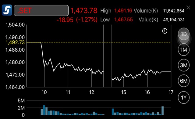 ตลท. 20 ก.ย. – ผู้สื่อข่าวรายงานดัชนีตลาดหุ้นไทยปิดการซื้อขายวันนี้ (20 ก.ย.) ที่ระดับ 1,473.78 จุด ลดลง 18.95จุด หรือร้อยละ 1.27 มูลค่าการซื้อขาย 49,194.03 ล้านบาท หุ้นไทยเคลื่อนไหวแดนลบตลอดวัน โดยดัชนีลงไปต่ำสุดที่ 1,467.55 จุด มีแรงขายออกมาในหุ้นขนาดใหญ่ หลังจากนักลงทุนมีความกังวลและติดตามผลการประชุมธนาคารกลางสหรัฐ (เฟด) ว่าจะมีการคง หรือปรับขึ้นอัตราดอกเบี้ย นอกจากนี้ ติดตามผลการประชุมธนาคารกลางญี่ปุ่น (บีโอเจ) ว่าจะมีการเพิ่มมาตรการอัดฉีดสภาพคล่องหรือไม่ ซึ่งการประชุมธนาคารกลางทั้ง 2 แห่งมีขึ้นระหว่างวันที่ 20-21 กันยายนนี้