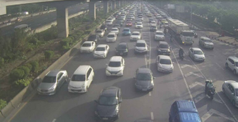 ถนนรัชดา-รามอินทรา ขาเข้า มุ่งหน้าไปทางถนนประเสริฐมนูกิจ รถติดขัด ขยับได้ทีละนิด ท้ายแถวสะสมใต้วงแหวนตะวันออก