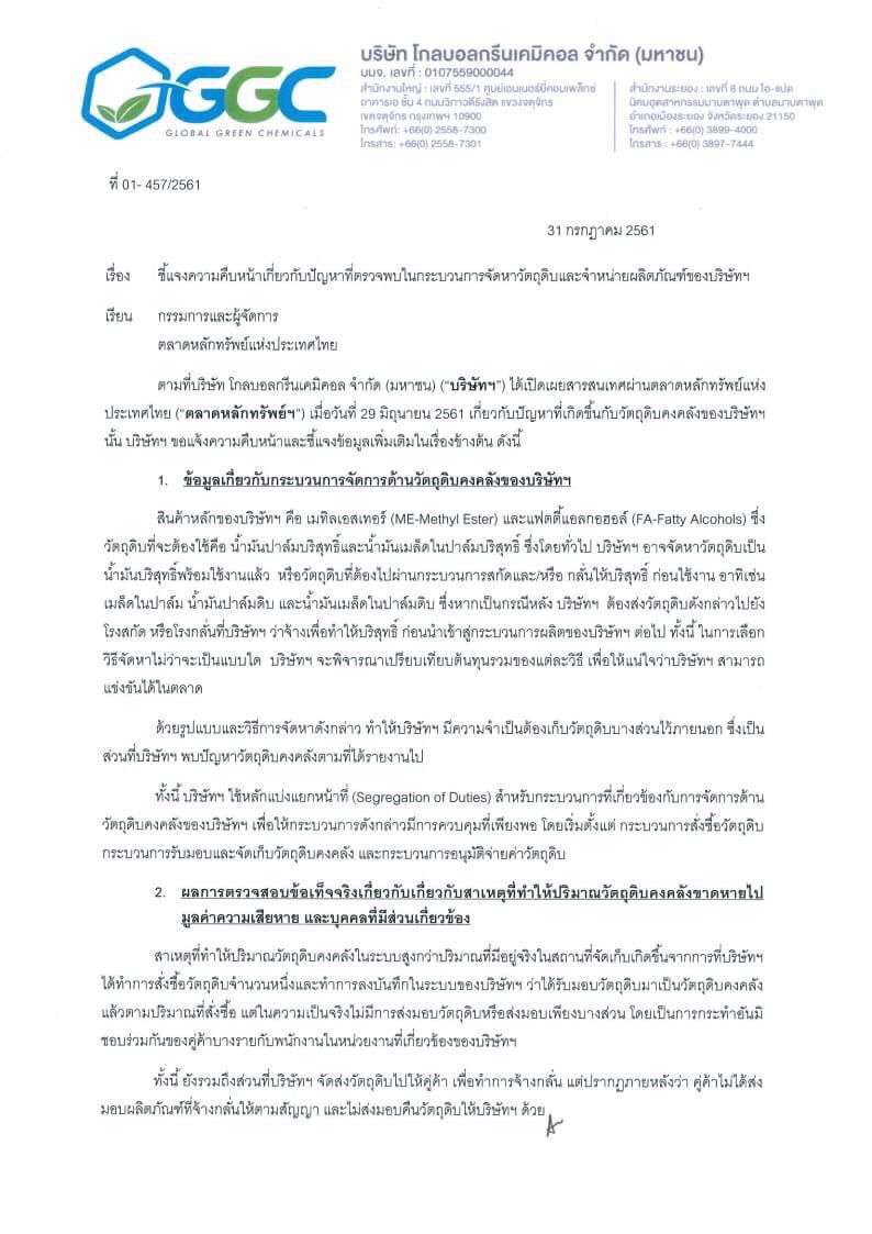 บมจ.โกลบอลกรีนเคมิคอล (GGC) แจ้งตลาดหลักทรัพย์แห่งประเทศไทย (ตลท.) ถึงผลตรวจสอบกรณีวัตถุดิบคงคลังหายมูลค่าประเมินเบื้องต้น 2,100 ล้านบาท พบว่าเป็นการกระทำอันมิชอบร่วมกันของคู่ค้าบางรายกับพนักงานในหน่วยงานที่เกี่ยวข้องของบริษัท รวมถึงส่วนที่บริษัทจัดส่งไปให้คู่ค้า เพื่อทำการจ้างกลั่น แต่คู่ค้าไม่ได้ส่งมอบผลิตภัณฑ์ที่จ้างกลั่นให้ตามสัญญาและไม่ส่งมอบคืนวัตถุดิบให้บริษัทด้วย อย่างไรก็ตาม การประเมินมูลค่าความเสียหายในวงเงินประมาณ 2,100 ล้านบาทนั้น อาจจะลดลงต่ำกว่านั้นได้ หากสามารถทวงถามวัตถุดิบที่ยังไม่ได้ส่งมอบกลับมาได้