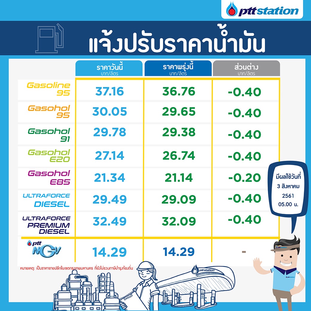 PTTOR และ บางจากฯ ประกาศปรับราคาขายปลีกน้ำมันทุกชนิดลดลง 40 สตางค์ต่อลิตร ยกเว้น E85 ลดลง 20 สตางค์ต่อลิตร มีผล 3 สิงหาคม 2561 เวลา 05.00 น. เป็นต้นไป โดยราคาขายปลีกจะเป็นดังนี้ เบนซิน 95 ลิตรละ 36.76 บาท แก๊สโซฮอล์ 95 ลิตรละ 29.65 บาท แก๊สโซฮอล์ 91 ลิตรละ 29.38 บาท E20 ลิตรละ 26.74 บาท E85 ลิตรละ 21.14 บาท ดีเซล 29.09 บาท และดีเซลพรีเมี่ยม 32.09 บาทต่อลิตร โดยราคาขายปลีกข้างต้นยังไม่รวมภาษีบำรุงกรุงเทพมหานคร.-สำนักข่าวไทย
