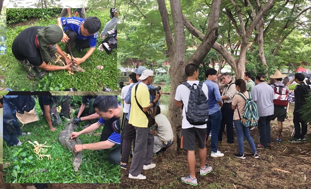 บรรยากาศภายในสวนลุมพินี มีสื่อมวลชนทั้งไทยและต่างชาติจำนวนมากเข้าร่วมสังเกตการณ์ เจ้าหน้าที่ กทม. 12 คน ที่กระจายกำลังรอบสวนลุมพินี จับตัวเงินตัวทอง หรือตัวเหี้ย ครั้งที่ 3 โดยใช้ท่อพีวีซีผูกเชือกทำเป็นบ่วงคล้องและใช้ปลาดุกเป็นเหยื่อล่อ ประมาณ 2 ชั่วโมง เจ้าหน้าที่สามารถจับได้แล้วกว่า 10 ตัว