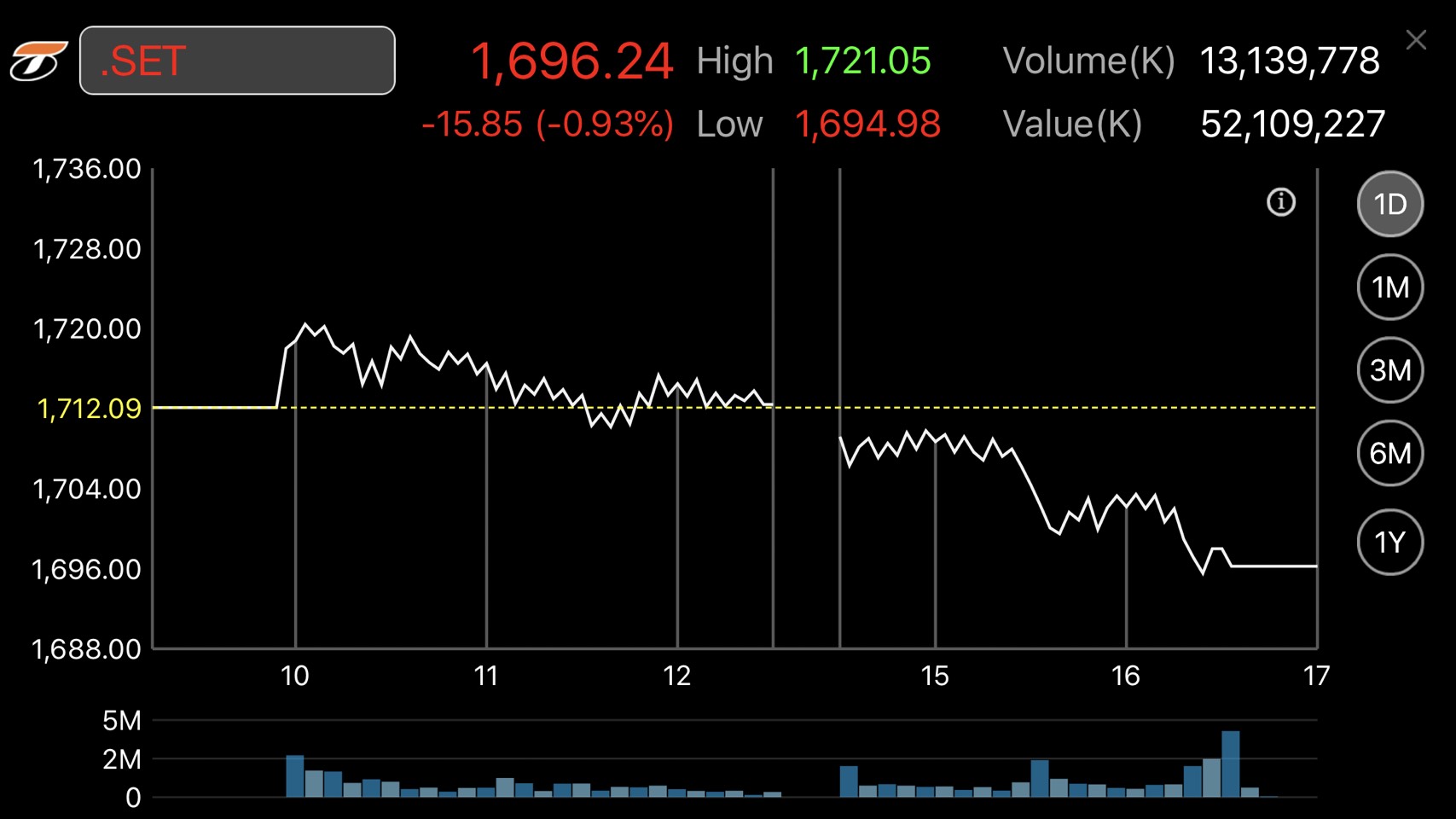 ผู้สื่อข่าวรายงานว่าดัชนีตลาดหลักทรัพย์ปิดวันนี้ (6 ส.ค.) ที่ 1,696.24 จุด ลดลง 15.85 จุด หรือร้อยละ 0.93 มูลค่าการซื้อขาย 52,109.23 ล้านบาท การซื้อขายหุ้นวันนี้ดัชนีเคลื่อนไหวแดนลบเป็นส่วนใหญ่ โดยดัชนีฯ แตะจุดสูงสุดที่ 1,721.05 จุด และแตะจุดต่ำสุดที่ระดับ 1,694.98 จุด