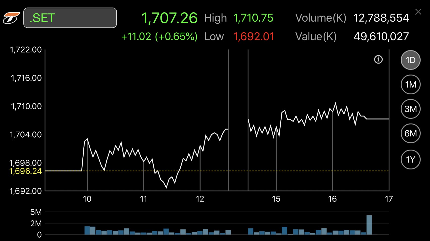 ผู้สื่อข่าวรายงานว่าดัชนีตลาดหลักทรัพย์ฯ ปิดวันนี้ (7 ส.ค.) ที่ระดับ 1,707.26 จุด เพิ่มขึ้น 11.02 จุด หรือร้อยละ 0.65 มูลค่าการซื้อขาย 49,610.03 ล้านบาท การซื้อขายหุ้นวันนี้ดัชนีเคลื่อนไหวแดนบวกเป็นส่วนใหญ่ โดยดัชนีฯ แตะจุดสูงสุดที่ 1,710.75 จุด และแตะจุดต่ำสุดที่ระดับ 1,692.01 จุด
