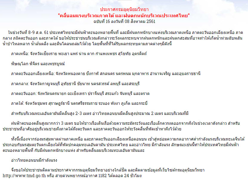 กทม. 8 ส.ค. – กรมอุตุนิยมวิทยาประกาศเตือนฉบับที่ 16 ลงวันที่ 08 สิงหาคม 2561 เรื่องคลื่นลมแรงบริเวณภาคใต้ และฝนตกหนักบริเวณประเทศไทย
