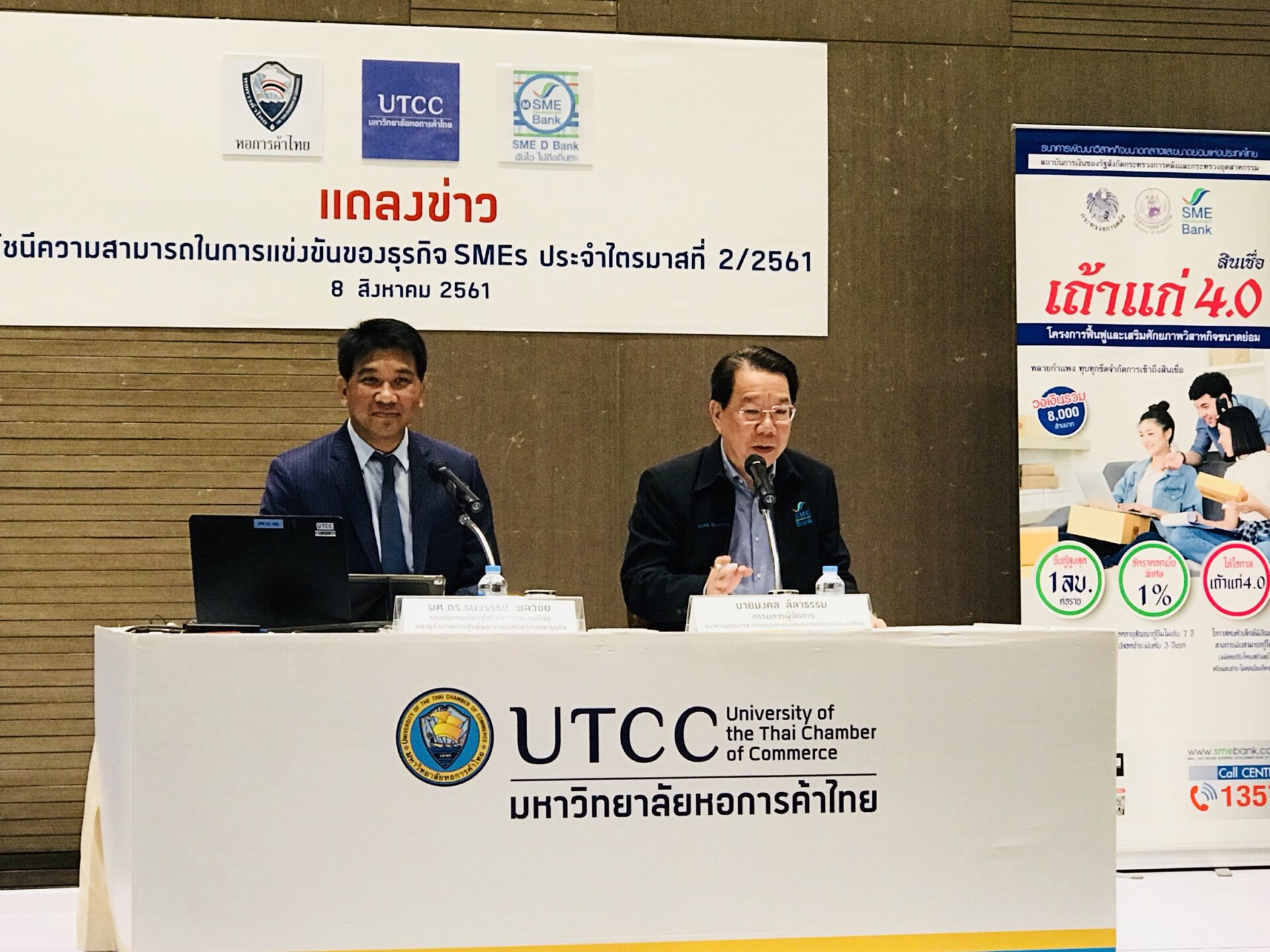 นายธนวรรธน์ พลวิชัย ผู้อำนวยการ ศูนย์พยากรณ์เศรษฐกิจและธุรกิจ มหาวิทยาลัยหอการค้าไทย กล่าวถึงผลสำรวจดัชนีความสามารถในการแข่งขันของธุรกิจเอสเอ็มอีไตรมาสที่ 2/2561 ซึ่งเป็นความร่วมมือระหว่างศูนย์พยากรณ์ฯ และธนาคารพัฒนาวิสาหกิจขนาดกลางและขนาดย่อมแห่งประเทศไทย (ธพว.) โดยผลสำรวจจากภาคธุรกิจที่ทาง ธพว.ร่วมประเมินในช่วงไตรมาส 2 ของปีนี้ อยู่ในระดับ 43.3 ปรับตัวเพิ่มขึ้น 0.5 จุด เมื่อเทียบกับไตรมาสแรกที่ผ่านมา แสดงให้เห็นสัญญาณฟื้นตัวที่ชัดเจน แต่ยังไม่เต็มที่ เนื่องจากยังต่ำกว่า 50 แต่ถือเป็นการฟื้นตัวแบบค่อยเป็นค่อยไป โดยเฉพาะเมื่อมีการวิเคราะห์พื้นฐานกลุ่มที่เป็นลูกค้าของ ธพว.มีการฟื้นตัวจากการดำเนินธุรกิจตามคำแนะนำและมีการขอสินเชื่อประกอบธุรกิจได้ดีกว่ากลุ่มที่ไม่ใช่ลูกค้าของ ธพว.อย่างมากไม่ว่าจะเป็นด้านสภาพคล่อง สตอกวัตถุดิบ หนี้สินรวม กำไรสะสม เป็นต้น