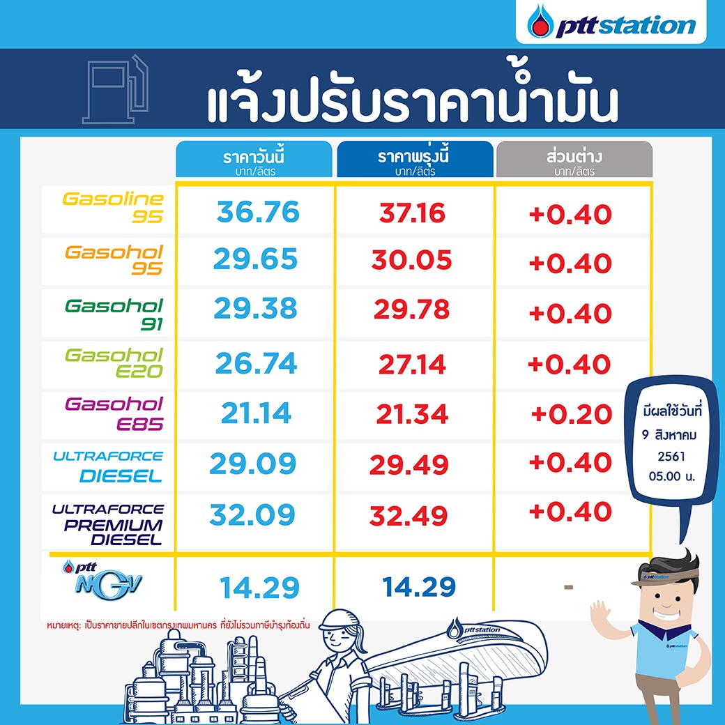 PTTOR และ BCP ประกาศปรับราคาขายปลีกน้ำมันทุกชนิดเพิ่มขึ้น 40 สตางค์ต่อลิตร ยกเว้น E85 เพิ่มขึ้น 20 สตางค์ต่อลิตร มีผล 9 สิงหาคม 2561 เวลา 05.00 น. เป็นต้นไป โดยราคาขายปลีกจะเป็นดังนี้ เบนซินลิตรละ 37.16 บาท แก๊สโซฮอล์ 95 ลิตรละ 30.05 บาท แก๊สโซฮอล์ 91 ลิตรละ 29.78 บาท E20 ลิตรละ 27.14 บาท E85 ลิตรละ 21.34 บาท ดีเซล 29.49 บาท และดีเซลพรีเมี่ยม 32.49 บาท โดยราคาขายปลีกข้างต้นยังไม่รวมภาษีบำรุงกรุงเทพมหานคร.-สำนักข่าวไทย
