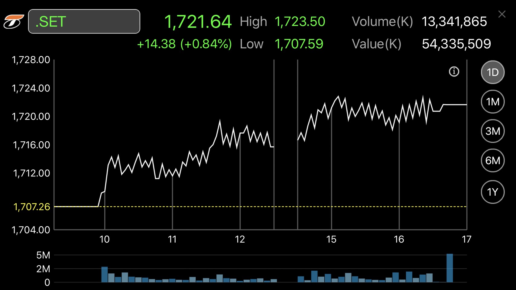 ผู้สื่อข่าวรายงานว่าดัชนีตลาดหลักทรัพย์ฯ ปิดวันนี้ (8 ส.ค.) ที่ 1,721.64จุด เพิ่มขึ้น 14.38 จุด มูลค่าการซื้อขาย 54,335.51 ล้านบาท การซื้อขายหุ้นวันนี้ดัชนีเคลื่อนไหวแดนบวก โดยดัชนีฯ แตะจุดสูงสุดที่ 1,723.50 จุด และแตะจุดต่ำสุดที่ระดับ 1,707.59จุด