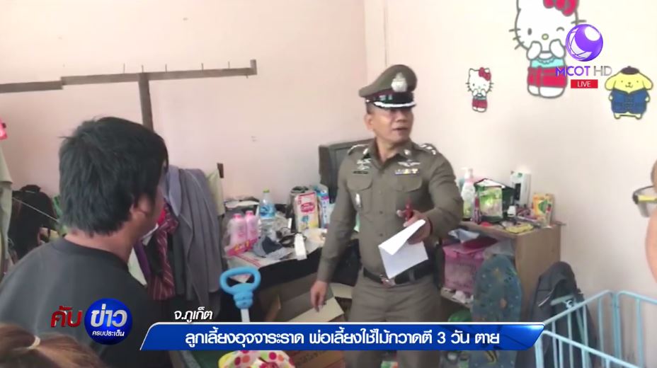 ภูเก็ต 9 ส.ค.-พ่อเลี้ยงอารมณ์ร้อน ใช้ด้ามไม้กวาดทุบตีลูกเลี้ยงขวบกว่า หลังอุจจาระเลอะบ้าน ผ่าน 3 วัน เกิดอาการช็อกนำส่ง รพ. ก่อนเสียชีวิต แพทย์ชันสูตรพบบาดแผลฟกช้ำตามร่างกายและเลือดคั่งในสมอง