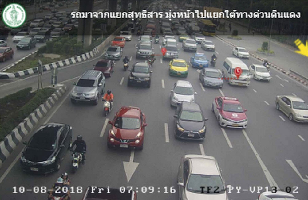 ถนนวิภาวดี-รังสิต ขาเข้า มุ่งหน้าแยกใต้ด่วนดินแดง รถติดขัด ท้ายแถวสะสมเต็มที่หน้า ม.หอการค้าไทย.-สำนักข่าวไทย