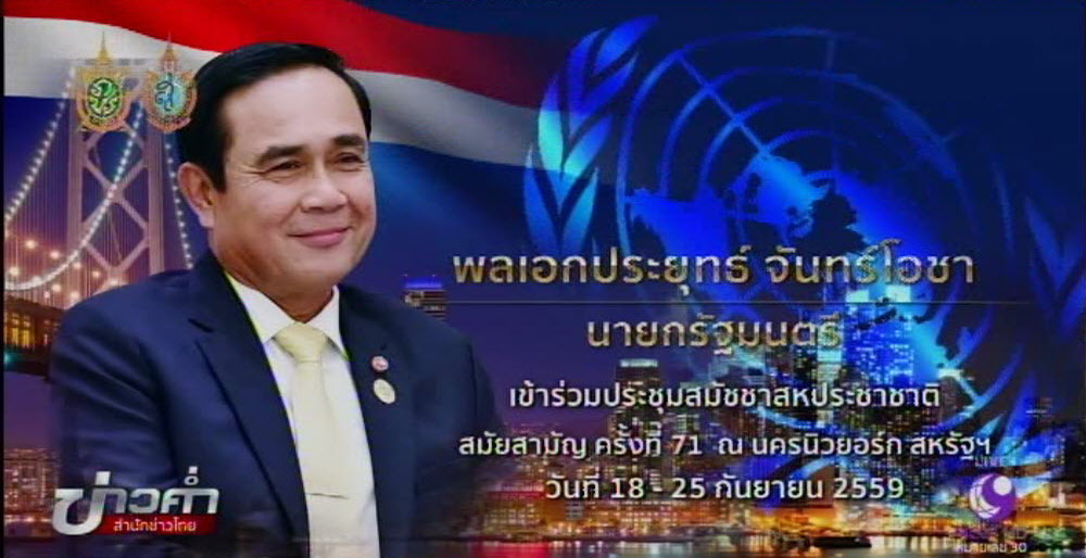 พล.อ.ประยุทธ์ จันทร์โอชา นายกรัฐมนตรี ออกเดินทางจากท่าอากาศยานสุวรรณภูมิ เมื่อกลางดึกวานนี้ (18 ก.ย.) เพื่อเข้าร่วมการประชุมสมัชชาสหประชาชาติ สมัยสามัญ ครั้งที่ 71 ที่นครนิวยอร์ก สหรัฐอเมริกา ระหว่างวันที่ 19-23 กันยายน การประชุมครั้งนี้เป็นการประชุมเต็มคณะปีแรก หลังจากที่สหประชาชาติประกาศเป้าหมายเพื่อการพัฒนาอย่างยั่งยืนในปี 2030 โดยนายกรัฐมนตรีจะกล่าวถ้อยแถลงร่วมกับประมุข ผู้นำและผู้แทนประเทศต่างๆ 195 คน ในหัวข้อ เป้าหมายการพัฒนาที่ยั่งยืน การผลักดันในระดับสากลเพื่อการเปลี่ยนแปลงโลกของเรา เพื่อแสดงวิสัยทัศน์และหยิบยกบทบาทของไทยในภารกิจ 3 เสาสำคัญของสหประชาชาติ คือ ด้านเศรษฐกิจและการพัฒนา ด้านสังคม และความมั่นคง