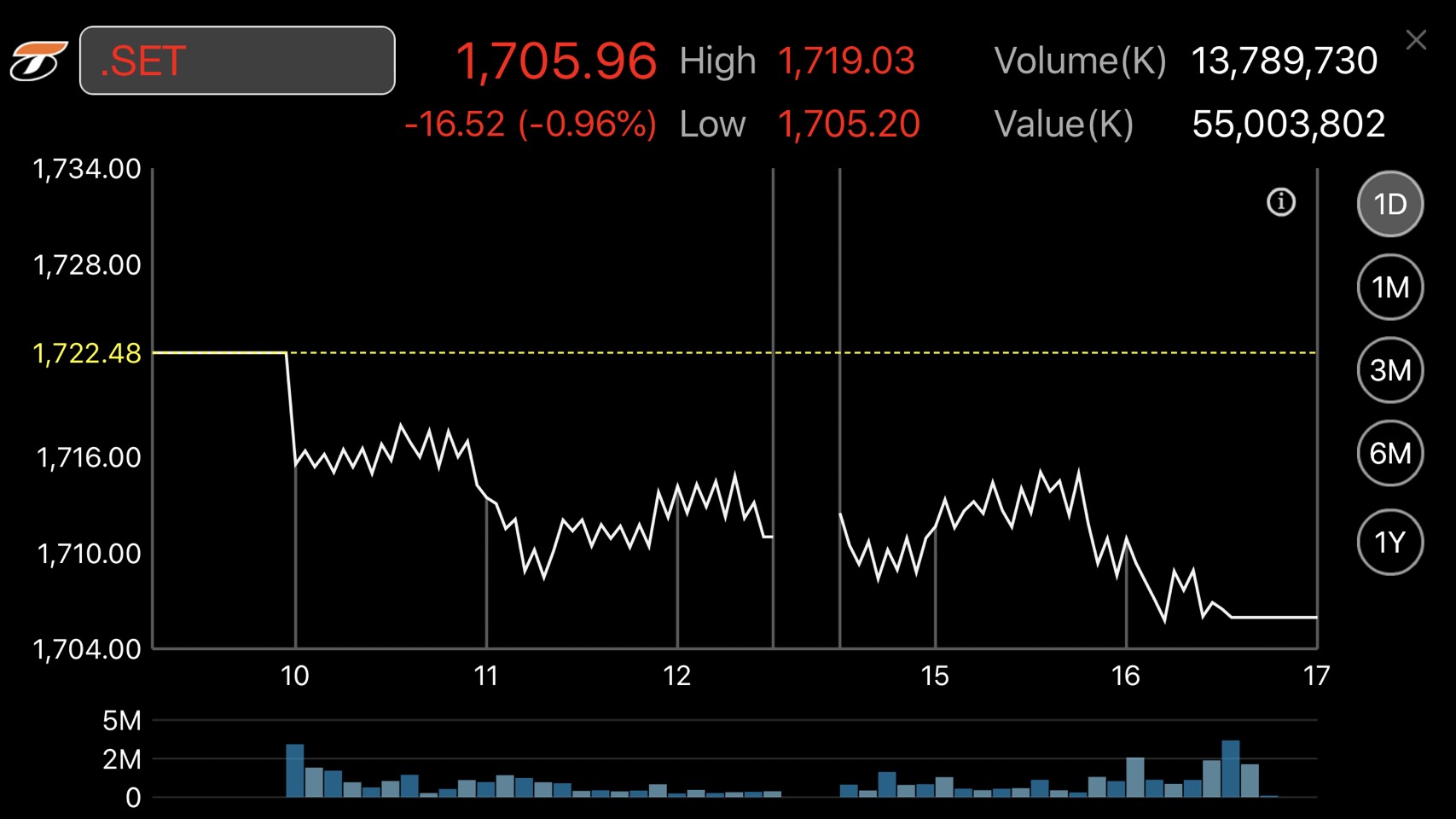 การซื้อขายหุ้นวันนี้ ดัชนีหุ้นไทยเคลื่อนไหวในแดนลบตลอดทั้งวัน โดยดัชนีฯแตะจุดสูงสุดที่ 1,719.03 จุด และแตะจุดต่ำสุดที่ระดับ 1,705.20 จุด