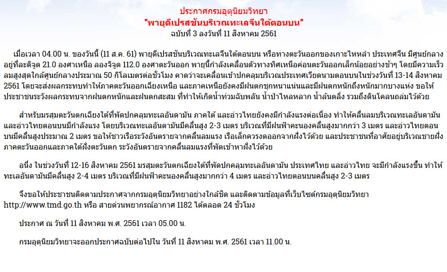 กรมอุตุนิยมวิทยาประกาศเตือนฉบับที่ 3 ลงวันที่ 11 สิงหาคม 2561 เรื่อง “พายุดีเปรสชันบริเวณทะเลจีนใต้ตอนบน” เมื่อเวลา 04.00 น. วันนี้ (11 ส.ค. 61) พายุดีเปรสชันบริเวณทะเลจีนใต้ตอนบน หรือทางตะวันออกของเกาะไหหลำ ประเทศจีน มีศูนย์กลางอยู่ที่ละติจูด 21.0 องศาเหนือ ลองจิจูด 112.0 องศาตะวันออก พายุนี้กำลังเคลื่อนตัวทางทิศเหนือค่อนตะวันออกเล็กน้อยอย่างช้าๆ โดยมีความเร็วลมสูงสุดใกล้ศูนย์กลางประมาณ 50 กิโลเมตรต่อชั่วโมง คาดว่าจะเคลื่อนเข้าปกคลุมบริเวณประเทศเวียดนามตอนบนในช่วงวันที่ 13-14 สิงหาคม 2561 โดยจะส่งผลกระทบทำให้ภาคตะวันออกเฉียงเหนือ และภาคเหนือยังคงมีฝนตกชุกหนาแน่น และมีฝนตกหนักถึงหนักมากบางแห่ง ขอให้ประชาชนระวังผลกระทบจากฝนตกหนักและฝนตกสะสมที่ทำให้เกิดน้ำท่วมฉับพลัน น้ำป่าไหลหลาก น้ำล้นตลิ่ง รวมถึงดินโคลนถล่มไว้ด้วย