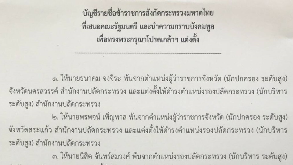 ที่ประชุมคณะรัฐมนตรี (ครม.) เห็นชอบบัญชีรายชื่อโยกย้ายข้าราชการระดับสูงของกระทรวงมหาดไทย 18 ตำแหน่ง ตามที่กระทรวงมหาดไทย เสนอ ดังนี้ 1.นายธนาคม จงจิระ ผู้ว่าราชการจังหวัดนครสวรรค์ เป็นรองปลัดกระทรวงมหาดไทย 2.นายพรพจน์ เพ็ญพาส ผู้ว่าราชการจังหวัดสระแก้ว เป็นรองปลัดกระทรวงมหาดไทย 3.นายนิสิต จันทร์สมวงศ์ รองปลัดกระทรวงมหาดไทย เป็น อธิบดีกรมการพัฒนาชุมชน 4.นายประยูร รัตนเสนีย์ รองปลัดกระทรวงมหาดไทย เป็น อธิบดีกรมที่ดิน
