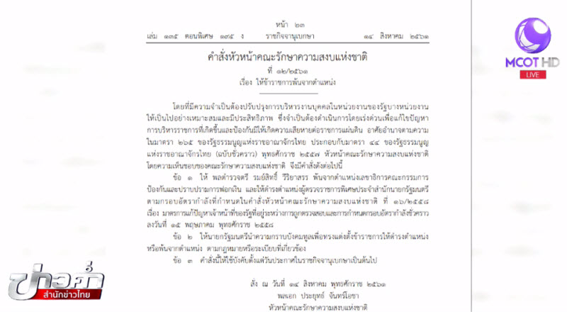 กรุงเทพฯ 14 ส.ค. – หัวหน้า คสช. ใช้อำนาจตามมาตรา 44 ให้ “พล.ต.ต.รมย์สิทธิ์” พ้นจากตำแหน่งเลขาธิการ ปปง.