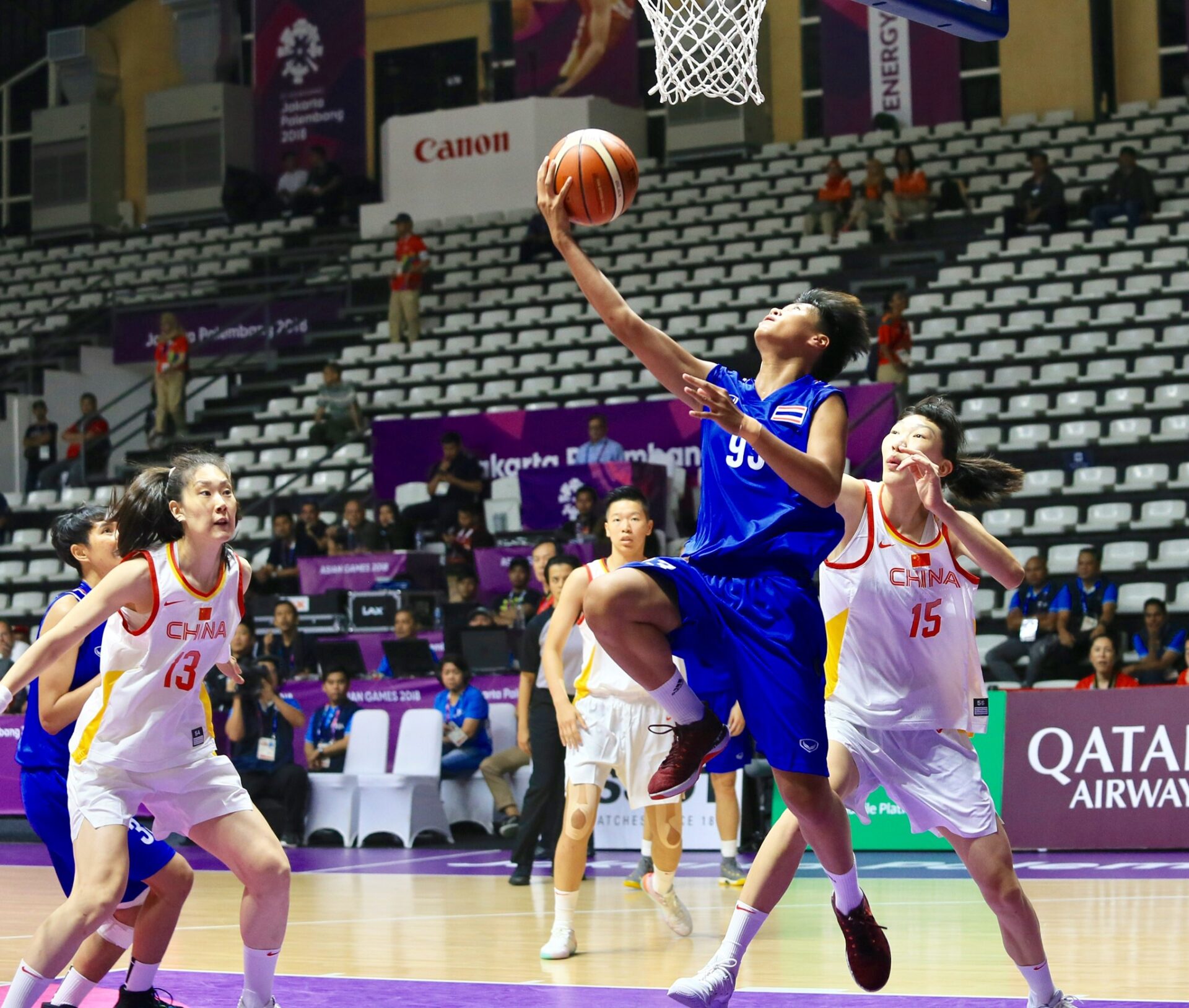 กีฬาเอเชียนเกมส์ ครั้งที่ 18 กรุงจาการ์ตา ประเทศอินโดนีเซีย โดยบาสเกตบอลทีมหญิง แข่งขันที่จีบีเค บาสเกตบอล ฮอลล์ กลุ่มบี รอบแรก นัดแรก ทีมบาสเกตบอลสาวทีมชาติไทย พบกับ ทีมชาติจีน ผลปรากฏว่า ควอเตอร์แรก สาวจีนออกนำไทยไปถึง 30-7 คะแนน ส่วน 3 ควอเตอร์ที่เหลือเป็นสาวจีนที่เล่นได้เหนือกว่ามาก เอาชนะสาวไทย 110 ต่อ 42 แต้ม โดย เซิน เม็งโกหราน ทำคนเดียว 16 แต้ม ส่วน กนกวรรณ ประจวบสุข ทำแต้มให้ไทยสูงสุด 11 แต้ม นัดต่อไปไทยพบกับฮ่องกง วันที่ 19 สิงหาคมนี้