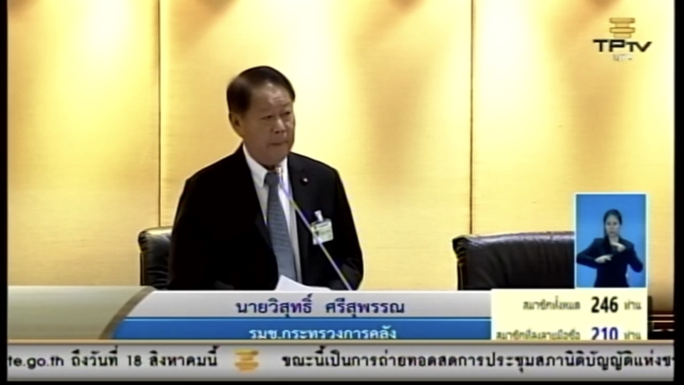 จากนั้น ได้พิจารณาร่างพระราชบัญญัติธุรกิจสถาบันการเงิน (ฉบับที่ ..) พ.ศ. ….ที่คณะรัฐมนตรีเป็นผู้เสนอ โดย นายวิสุทธิ์ ศรีสุพรรณ รัฐมนตรีช่วยว่าการกระทรวงการคลัง ชี้แจงสาระสำคัญ ว่า เป็นการแก้ไขเพิ่มเติมพระราชบัญญัติธุรกิจสถาบันการเงิน ปี 2551 เพื่อกำหนดให้ธนาคารแห่งประเทศไทยมีอำนาจประกาศกำหนดหลักเกณฑ์ให้สถาบันการเงินเฉพาะกิจ ถือปฏิบัติหรือปฏิบัติเพิ่มเติมและแต่งตั้งผู้ตรวจการสถาบันการเงินเฉพาะกิจเพื่อตรวจสอบสถาบันการเงินเฉพาะกิจ และแก้ไขเพิ่มเติมบทกำหนดโทษกรณีที่มีการฝ่าฝืนหรือไม่ปฏิบัติตามหลักเกณฑ์ที่กำหนด เพื่อให้การกำกับดูแลสถาบันการเงินเฉพาะกิจเป็นไปอย่างมีประสิทธิภาพ ทำให้สถานบันการเงินเฉพาะกิจมีความมั่นคงทางการเงิน และป้องกันความเสียหายที่อาจเกิดขึ้นกับสถาบันการเงินเฉพาะกิจ ซึ่งจะเป็นประโยชน์ต่อเศรษฐกิจของประเทศ เนื่องจากสถาบันการเงิน ถือเป็นเครื่องมือของรัฐในการดำเนินกิจการทางการเงินเพื่อประชาชน เพิ่มขีดความสามารถในการแข่งขันของประเทศอย่างมีประสิทธิภาพ ซึ่งจะช่วยลดความเหลื่อมล้ำในสังคมได้