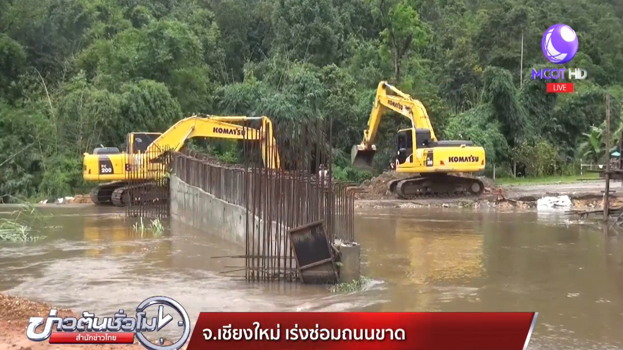 เจ้าหน้าที่แขวงทางหลวงเชียงใหม่ที่ 2 เร่งนำรถแบ็กโฮขนาดใหญ่ เข้าขุดขยายถนนทางเบี่ยง บริเวณกิโลเมตรที่ 43 บ้านปางแฟน อำเภอดอยสะเก็ด จังหวัดเชียงใหม่ เพื่อเร่งระบาย น้ำป่าที่ท่วม ซัดถนนขาด โดยจะใช้ท่อซีเมนต์ขนาดใหญ่ ฝังทำทางเบี่ยง ให้รถสามารถวิ่งผ่านได้ ส่วนกิโลเมตรที่ 45 – 47 ยังต้องใช้เวลาซ่อมแซม เนื่องจากถนนมีขนาดกว้าง รวมทั้งกำลังเร่งกู้รถบรรทุก 10 ล้อ ที่ตกลงไปในลำน้ำ ที่กิโลเมตรที่ 47 นอกจากนี้น้ำป่า ยังซัด สะพานไม้ข้ามลำน้ำ บริเวณอุทยานแห่งชาติแม่ตะไคร้ บ้านแม่หวาน เสียหาย เจ้าหน้าที่ไม่สามารถข้ามฝั่งได้ ต้องเดินเท้าระยะทางไกลเกือบ 2 กิโลเมตร มายังที่ทำการอุทยานฯ และเตือนประชาชน ที่มีบ้านเรือนติดลำน้ำแม่กวง อำเภอดอยสะเก็ด และอำเภอสันกำแพง ให้ระวังน้ำป่าไหลหลากด้วย.-สำนักข่าวไทย