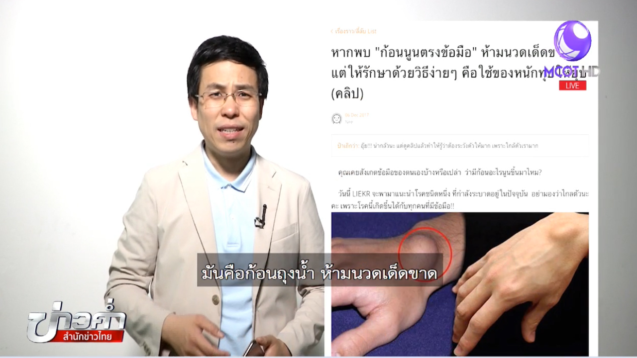 สำนักข่าวไทย 18 ส.ค.-บนสังคมออนไลน์แชร์ว่าหากใครมีก้อนถุงน้ำที่ข้อมือ ให้ใช้ของหนักทุบให้ยุบเองได้ เรื่องนี้จริงหรือไม่ ติดตามจากศูนย์ชัวร์ก่อนแชร์.-สำนักข่าวไทย