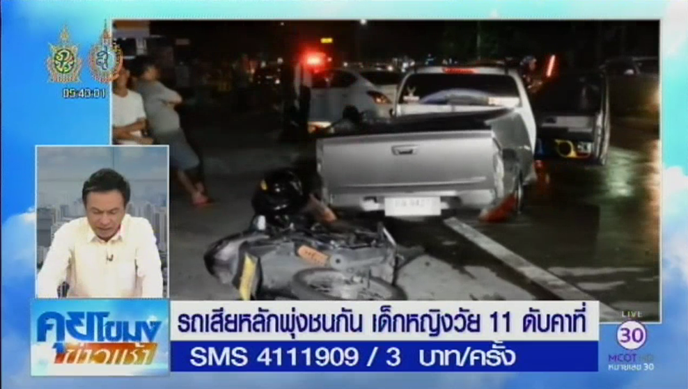 นนทบุรี 19 ก.ย.-รถกระบะเสียหลักปีนข้ามเกาะกลางถนน และชนเสาไฟฟ้า แล้วพุ่งชนรถเก๋งและจักรยานยนต์ฝั่งตรงข้าม ส่งผลเด็กหญิงวัย 11 ปี เสียชีวิตคาที่ และมีผู้บาดเจ็บอีก 2 ราย