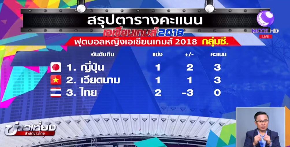 ฟุตบอลหญิง กลุ่มซี นัดที่ 2 ที่เมืองปาเล็มบัง ทีมทีมชาติไทย แพ้ เวียดนาม 2-3 ทำให้ทีมไทยแพ้ 2 นัดรวดไม่มีคะแนน อยู่อันดับ 3 ของกลุ่มแน่นอนแล้ว แต่ยังมีลุ้นเข้ารอบในฐานอันดับ 3 ที่ดีที่สุด แต่ต้องลุ้นฮ่องกง ให้แพ้ เกาหลีเหนือ และทาจิกิสถาน แพ้ จีน ในวันนี้ เนื่องจากประตูได้เสียทีมไทยดีกว่าทั้งสองทีมนี้ แม้ว่าทีมไหนจะเป็นอันดับ 3 พอตัดคะแนนกับการพบกับทีมอันดับสุดท้ายของกลุ่มบี ออกก็จะมี 0 คะแนน ส่วนเวียดนามเข้ารอบกับญี่ปุ่นแน่นอนแล้ว โดยทั้งคู่ต้องลุ้นว่าใครจะเป็นอันดับแชมป์กลุ่มซี ในวันที่ 21 สิงหาคมนี้.-สำนักข่าวไทย